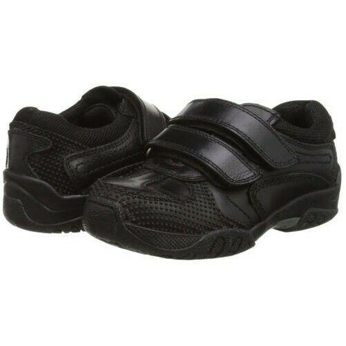 At last a school shoe that will with stand everyday robust use thanks to the Jezza by Hush Puppies!, Black leather upper, Double velcro strap fastening for a better fit, Rubber covers the toe and heel to protect the shoes making them very robust and allowing boys to be boys!, Padded tongue and ankle provides additional comfort, Reinforced toe and heel , Rubber grip textured outsole makes them a sturdy shoe , Hush Puppies come with a choice of 3 width fittings. Shoes are issued with a standard F fitting insole but this can be swapped to the red insole to allow the shoes to fit a narrow foot or a blue insole for a wider foot