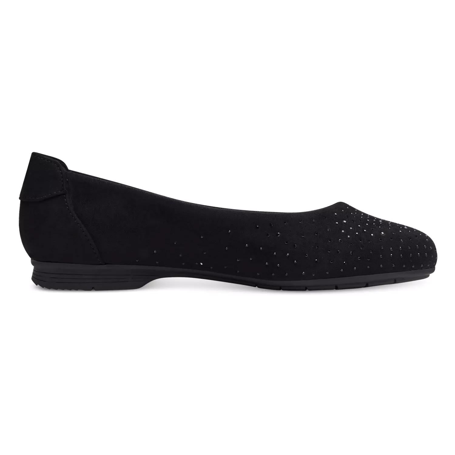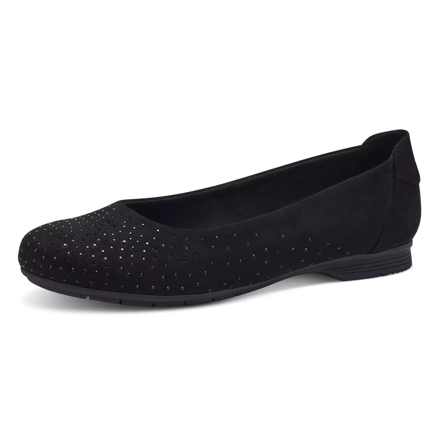 Elegant and simple ballerina shoes from Jana Softline with round toe. It has a fabric upper with suede look with beautiful small stones attached and textile lining. The soft insoles are covered with textiles and the outsoles are easily profiled and flexible. The h-reader provides extra width and space for the feet. This comfortable Jana ballerina is the ideal choice if you want both a feminine look and good comfort.