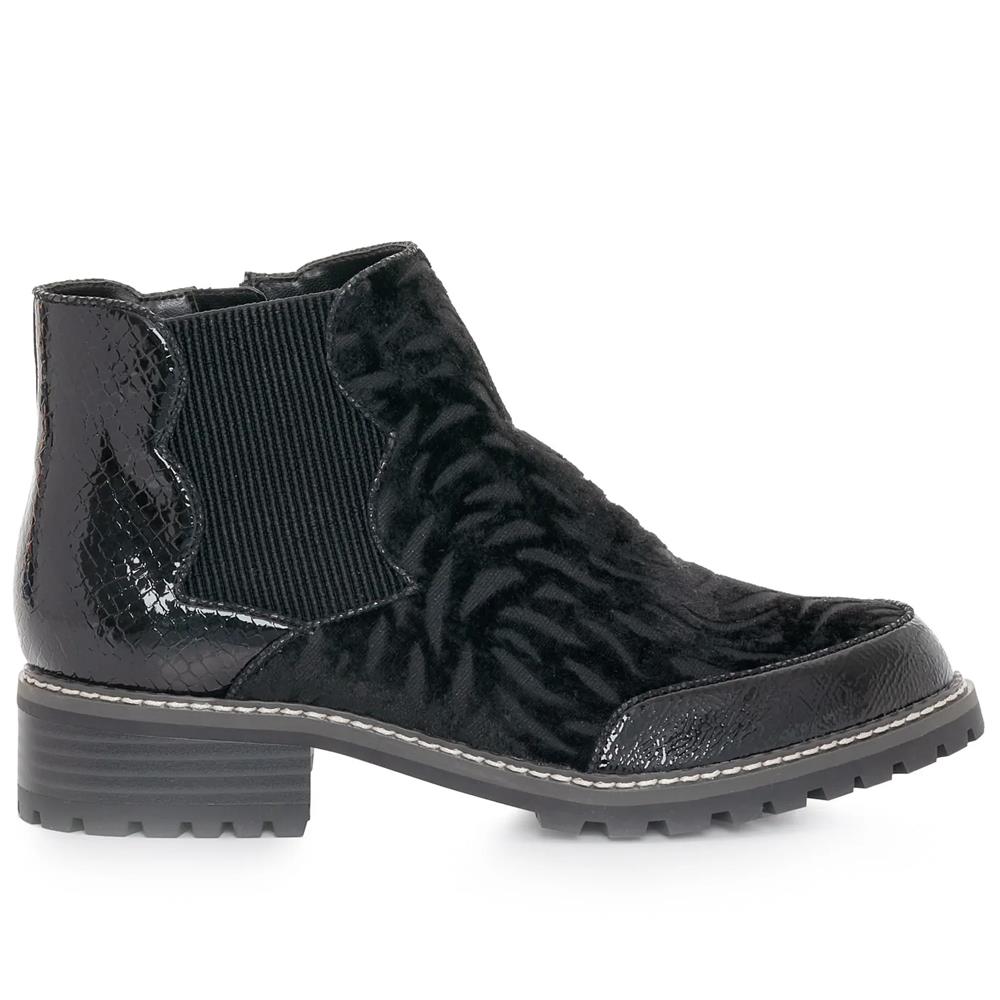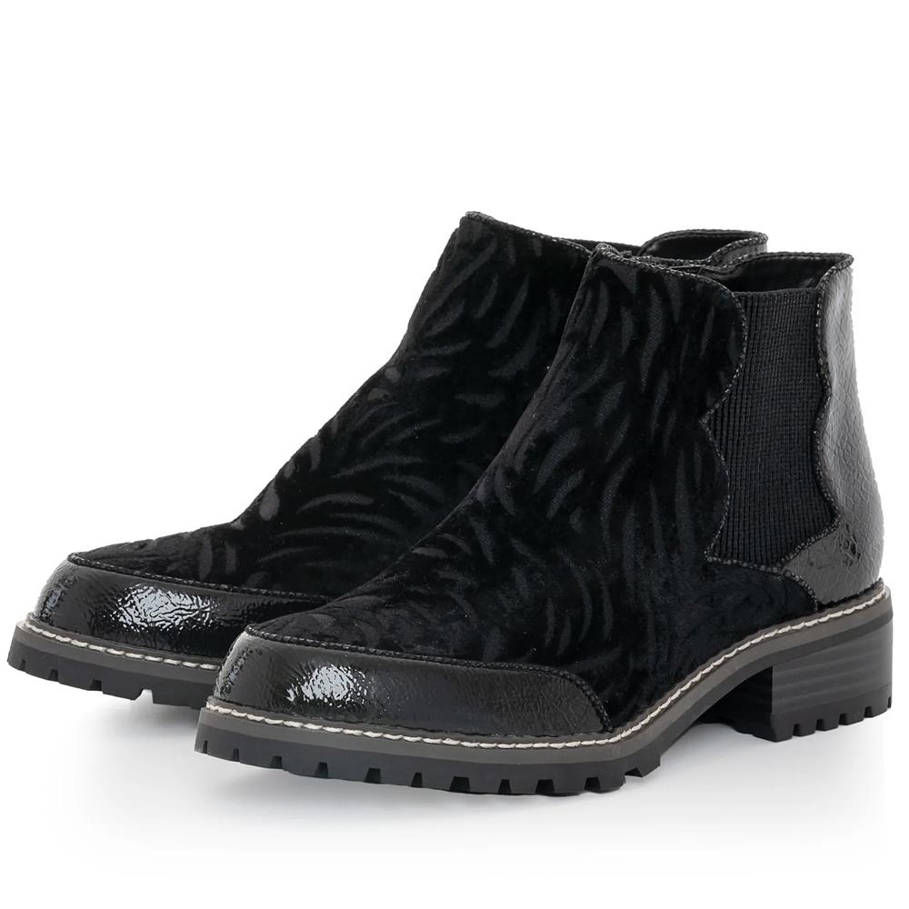 The RONNI boot, on a chunky, flexible sole, combines style and comfort. In glossy black patent, textured velvet and lizard effect emboss, and featuring an inner zip and elastic panel. Heel height is 3cm